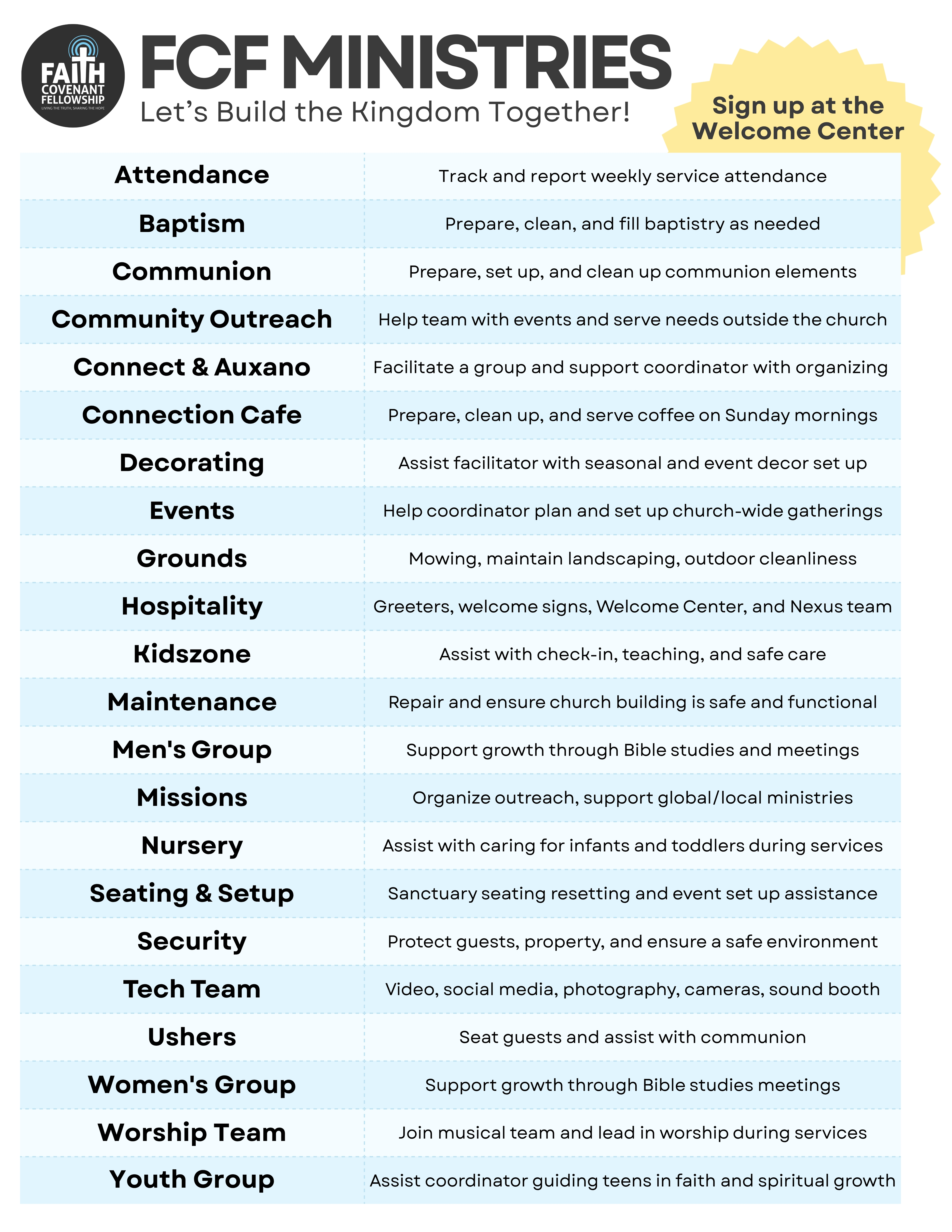 Let’s build the Kingdom together! Get involved and find your place to grow, serve and volunteer by joining one of our ministries.